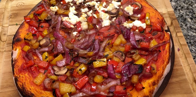 Quick and easy vegetarian pizza recipe with simple toppings found at home.