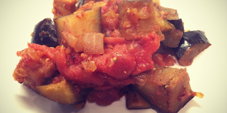 I love eggplant in any form but especially with tomatoes with spices. This is a simple recipe for a weeknight vegetarian dish. Enjoy!